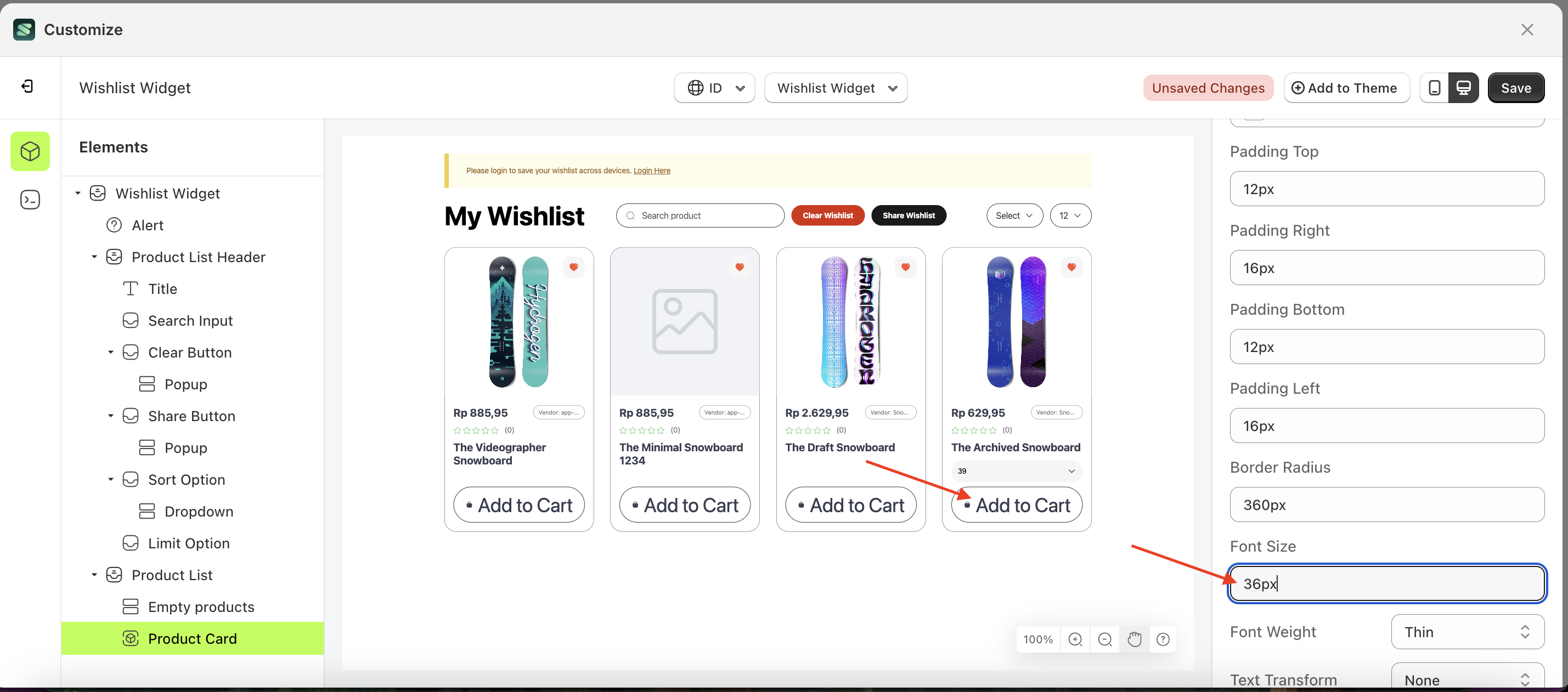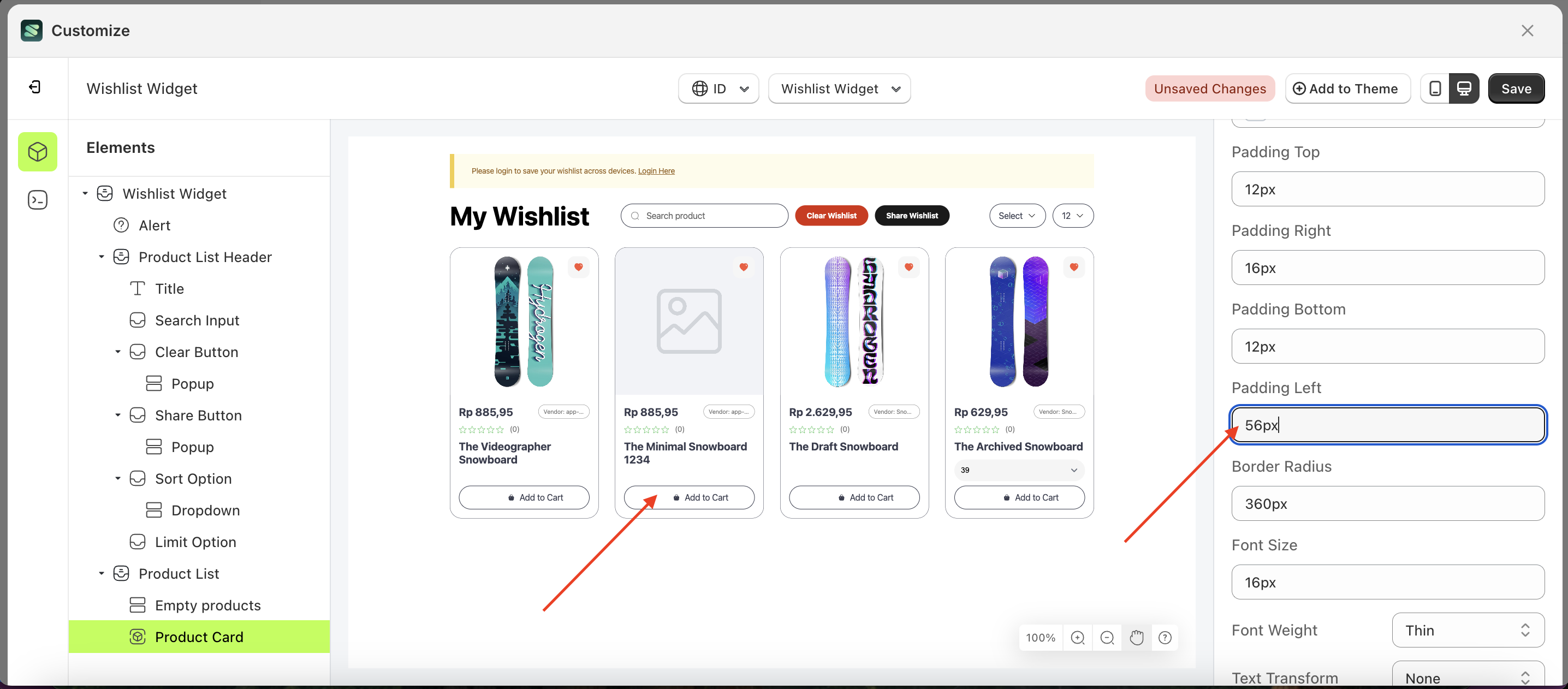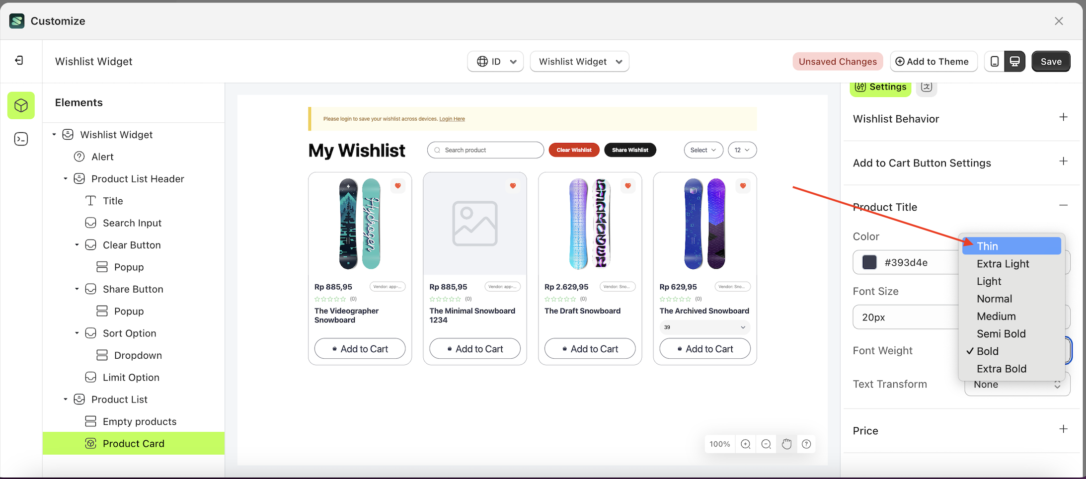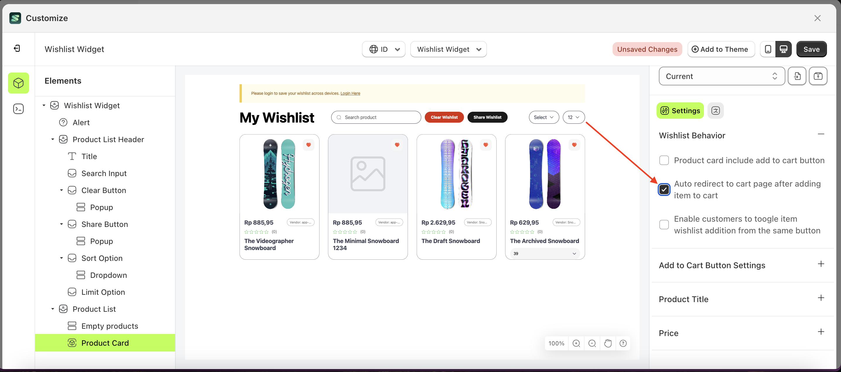 - The wishlist widget of the Product Card element will adjust accordingly.